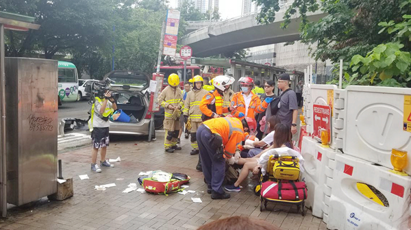 一輛私家車失控鏟上巴士站,多名傷者即場接受急救。網上圖片