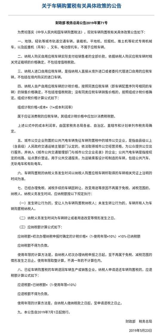 2018年12月29日,第十三届全国人民代表大会常务委员会第七次会议通过《中华人民共和国车辆购置税法》,规定车辆购置税的税率为10%,自2019年7月1日起施行。据业内人士分析,消费者在购买打折车时所需缴纳的车辆购置税将会有所减少,但购买加价车时,所需缴纳的车辆购置税会增加。