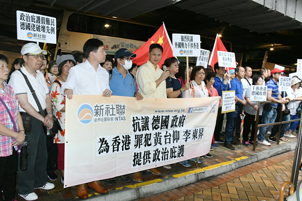 新界社團聯會昨日約30人到場抗議,對德國政府批准黃、李2人的難民庇護申請表示強烈譴責。他們指,2人一直主張「港獨」,但特區政府並沒有因其政治立場而作出檢控,故2人也不符合難民資格。德國政府包庇刑事嫌疑犯的行為,不但受到廣大香港市民質疑,也粗暴干涉了香港的司法制度。德國政府更向國際社會發出了誤導和不正確信息,詆毀了香港良好的司法制度和國際形象,對香港是一個極大的傷害。