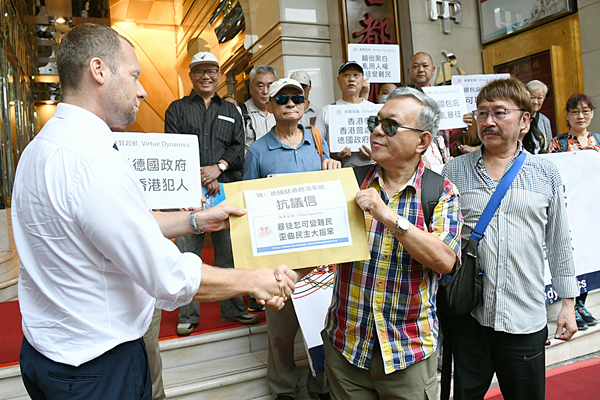 匯賢起動代表向德國駐港總領事館人員遞交請願信。記者馮瀚文攝