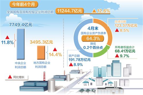 “从前4月情况看,国有企业利润、营业收入、成本费用利润率等各项主要指标保持增长,反映出国有企业运行态势良好,同时也是国民经济总体平稳、稳中有进的重要表现。”中国财政科学研究院副院长白景明说。