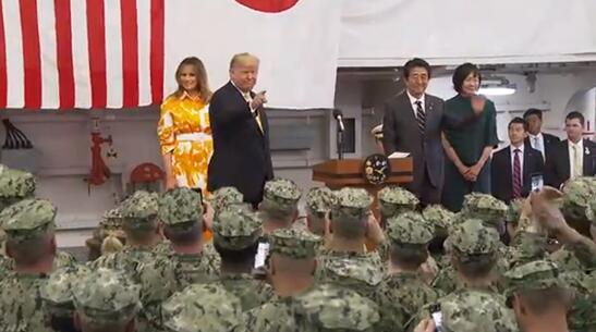 发表讲话后,特朗普和安倍等人来到甲板上,安倍目送特朗普乘直升机离开。在登舰参观“加贺”号后,特朗普还搭乘直升机登上停靠在横须贺基地的美海军“黄蜂”号两栖攻击舰,并在美海军官兵面前发表美日同盟相关讲话。
