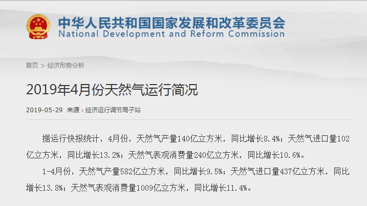 1-4月份,天然气产量582亿立方米,同比增长9.5%;天然气进口量437亿立方米,同比增长13.8%;天然气表观消费量1009亿立方米,同比增长11.4%。