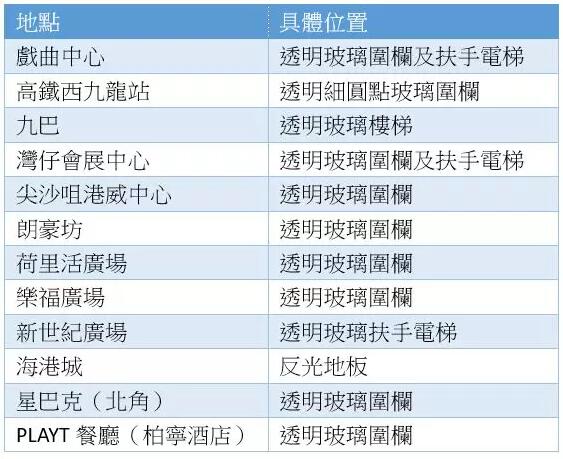 據大公文匯全媒體報道,民建聯婦女事務委員會連續第9年公佈香港12個“走光黑點”,當中包括戲曲中心、高鐵西九龍站、九巴巴士內新設計的玻璃樓梯、灣仔會展、尖沙咀港威中心、朗豪坊、荷里活廣場、樂富廣場、新世紀廣場、海港城、北角長康街星巴克,以及柏寧酒店PLAYT餐廳。