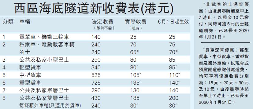 【香港商報网訊】西隧公司昨日宣布,將於本年6月1日(周六)起調整收費優惠及修訂實際收費。大部分車輛單程收費加5元;並將「非載客的士深宵優惠」及「貨車深宵優惠」推廣計劃延續至2020年1月31日,一切現有規則、條款及優惠時間均維持不變。