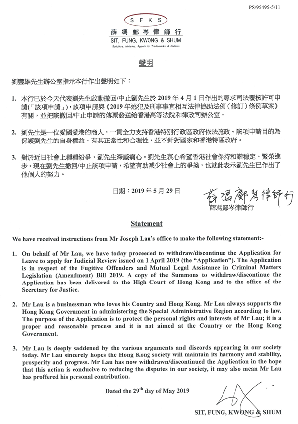 劉鑾雄辦公室透過其委託的薛馮鄺岑律師行發表聲明,指該行已於昨日代表劉鑾雄啟動撤回/中止其於4月1日就《逃犯條例》修訂尋求司法覆核許可申請,並把該撤回/中止申請的傳票發送給香港高等法院和律政司辦公室。