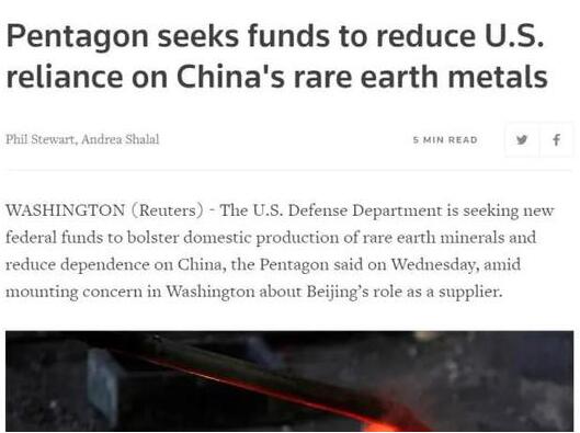 据路透社报道,五角大楼周三表示,美国国防部正在寻求新的联邦资金,以支持美国国内的稀土矿石的生产,并减少对中国稀土的依赖。