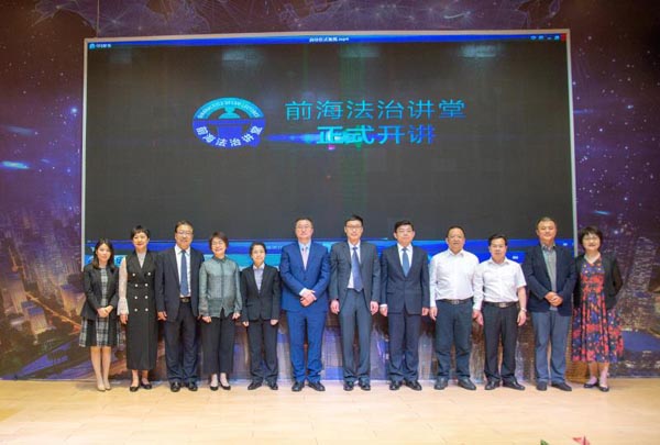 全國人大基本法委研究室副主任趙向陽,香港中聯辦法律部處長張鋒,港澳基本法研究會會長、清華大學教授王振民,香港律政司副法律政策專員李秀江,深圳市司法局黨委書記、局長蔣溪林,前海管理局副局長田敏,深圳市貿促委副主任甘敬鋒,前海一帶一路法律服務聯合會會長杜春,司法部港澳台法律培訓交流中心副主任董石,中國國際經濟貿易仲裁委員會(中國海事仲裁委員會)代表黎曉光,深圳市知識產權聯合會常務副會長王躍,香港和解中心秘書長黃欣一起觸動點亮屏幕,宣布「前海法治講堂」正式開講。