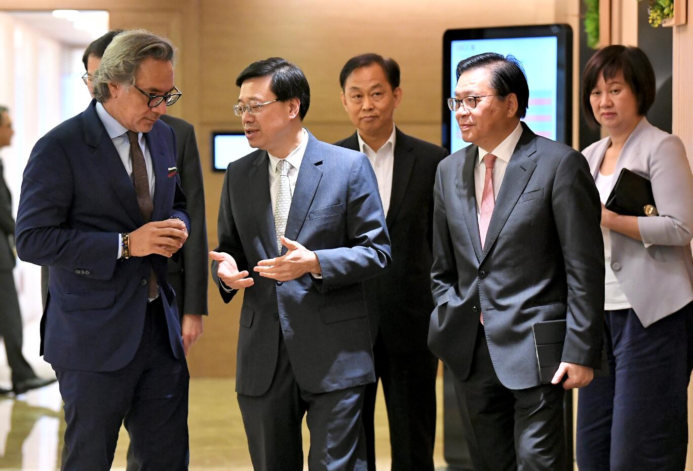 香港總商會日前與李家超(左二)就修訂《逃犯條例》事宜會 面。圖為總商會主席夏雅朗(左一)及理事林健鋒(右二)會後 與李家超交談。 資料圖片