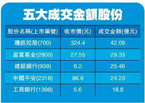 昨日成交金額排名前五的股份分別為騰訊(700)、盈富基金(2800)、建設銀行(939)、中國平安(2318)及工商銀行(1398)。其中騰訊則逆市向好升0.75%,報324.4元,成交金額達42.09億元。總結5月份,恒指暴跌2584點。