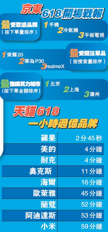 京東方面,昨日凌晨1時,京東銷售商品已達1700萬件,同比增加83%;北京、上海、廣州成為購買力最強的城市;榮耀20、華為P30、realme X佔據搜索排行榜前三的位置。