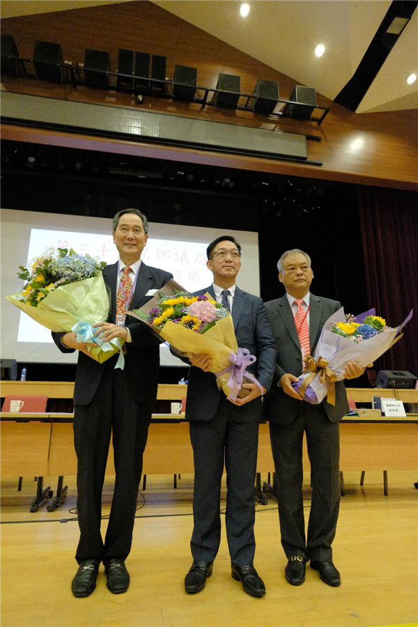 劉業強(中)連任鄉主席,林偉強(左)及莫錦貴當選副主席。