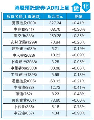 恒指夜期上周五收報26720點,低水181點。港股ADR個別發展,控(005)ADR折合港元收報63.92元,跌0.21%;中移動(941)ADR折合港元收報68.7元,升0.36%;騰訊(700)ADR折合港元收報327.34元,升0.41%。