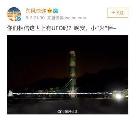 在昨晚,火箭军官方账号@东风快递 发布了一张东风21导弹夜间起竖的照片并配以文案“你们相信这世上有UFO吗?晚安,小“火”伴~ ”,这条微博中的“UFO梗”,指的就是最近在中国多地同时出现的不明飞行物造成的神秘天象,因此,这条微博开始引发网友谨慎的猜测,大家纷纷在转评中克制的表示:“懂了”。
