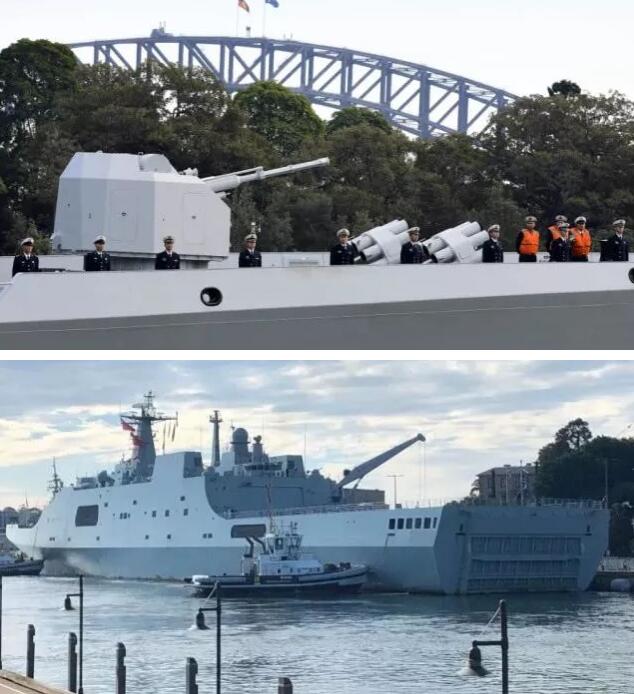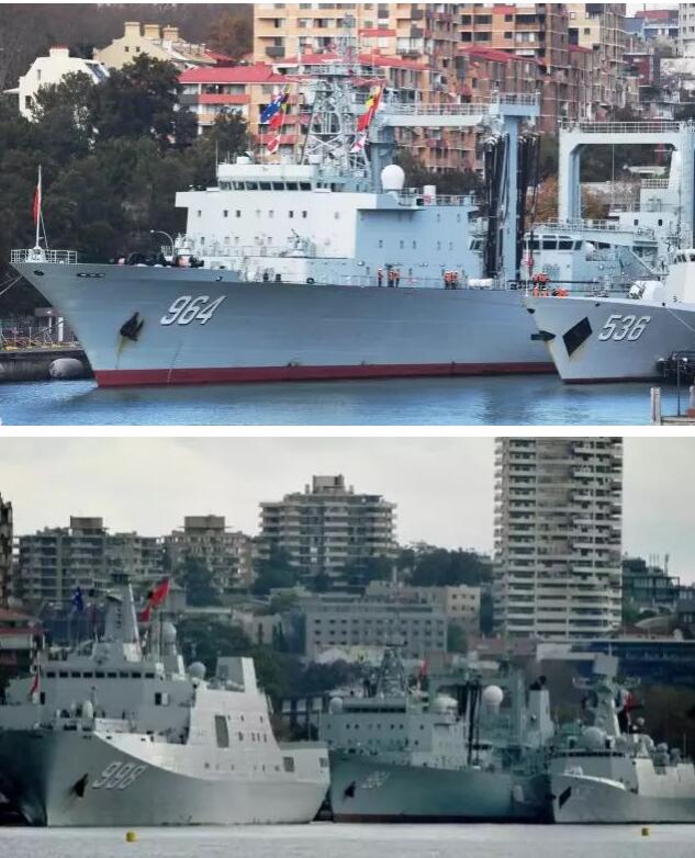 据悉,3艘中国军舰分别为1艘导弹护卫舰、1艘综合补给舰以及1艘两栖船坞登陆舰,全部停靠在距离悉尼歌剧院仅几百米的花园岛海军基地,这3艘军舰将在此停留4天。