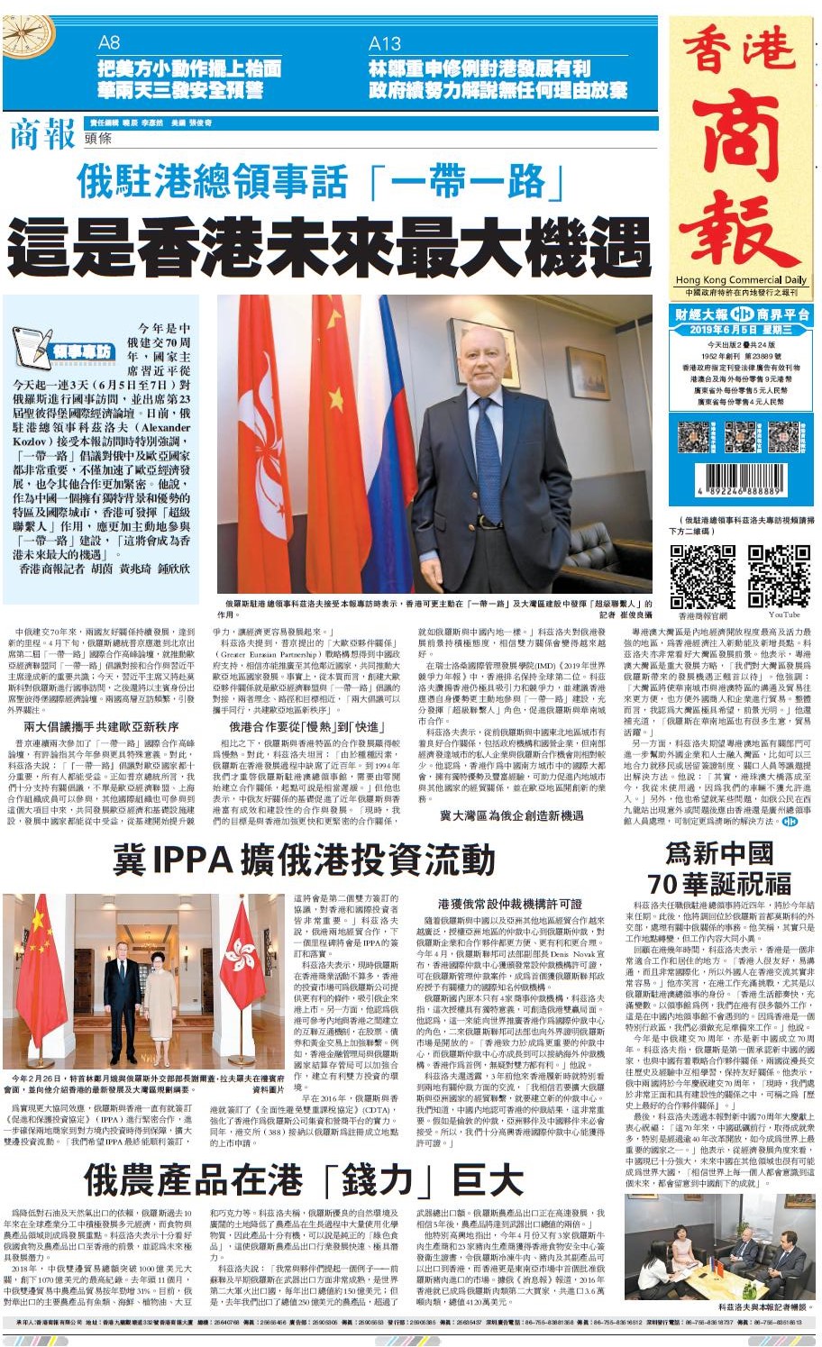 在瑞士洛桑國際管理發展學院(IMD)《2019年世界競爭力年報》中,香港排名保持全球第二位。科茲洛夫讚揚香港仍極具吸引力和競爭力,並建議香港應憑自身優勢更主動地參與「一帶一路」建設,充分發揮「超級聯繫人」角色,促進俄羅斯與華南城市合作。