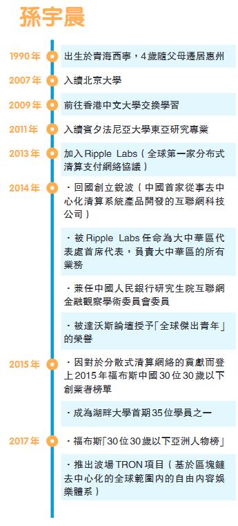 資料顯示,1990年7月出生的孫宇晨是波場TRON創始人,其所領導的移動社交應用「陪我」APP被稱為「90後移動社交第三極」。其個人官方微博認證信息為馬雲湖畔大學首期學員、陪我APP董事長兼CEO、微博簽約自媒體。此外,在2017年福布斯中國30位30歲以下精英榜單中,孫宇晨也上榜。