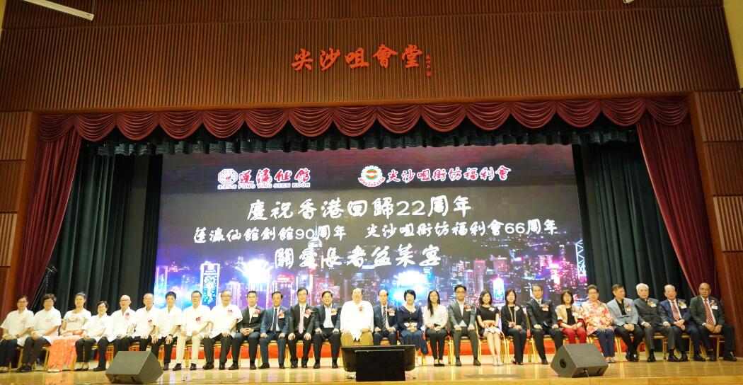 【香港商報网訊】記者呂明霞報道:為慶祝香港回歸22周年,蓬瀛仙館創館90周年及尖沙咀街坊福利會66周年,尖沙咀街坊福利會與蓬瀛仙館昨日假尖沙咀會堂舉行「關愛長者盆菜宴」。當天筵開51席,逾500位長者共品素食盆菜,亦有精彩節目助興。會場其樂融融,長者們笑逐顏開。