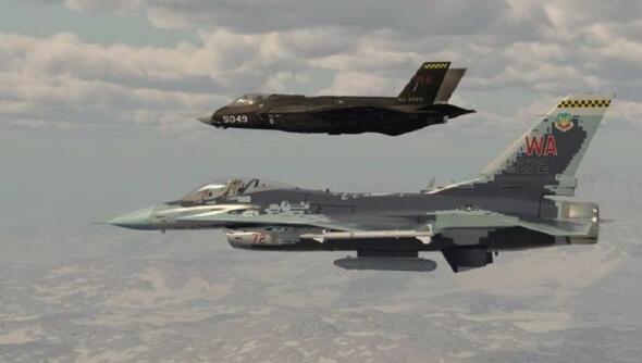资料图片:美军负责模拟苏-57的F-16和模拟FC-31的F-35假想敌机效果图。(图片来源于网络)