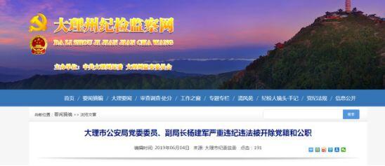 6月4日,云南大理州纪检监察网连续发布了大理市公安局副局长杨仁伟和大理市公安局党委委员、副局长杨建军被双开的通报。
