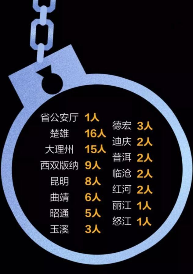除大理公安系统连续地震外,云南约有14个州市都陆续传出过公安系统人员被查的消息。据不完全统计,今年截至5月17日,云南公安系统人员被查出或移送司法机关的约有76人!