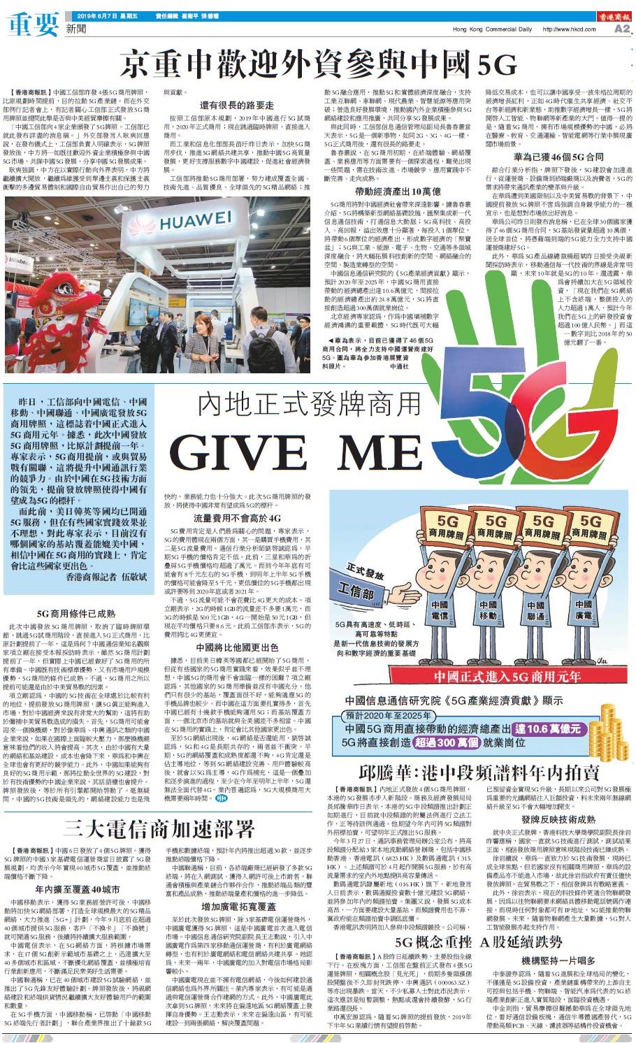 徐岩續說,華為一直致力於5G技術發展,現時已成全球焦點,但若國家沒有相關商用牌照,華為的設備產品亦不能進入市場,故此徐岩指政府有責任儘快發放牌照。在貿易戰之下,相信發牌具有戰略意義。