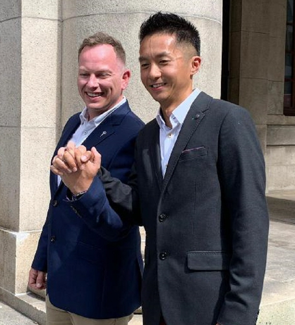 梁鎮罡(右)及同性伴侶在終院外對上訴裁決感到興奮。