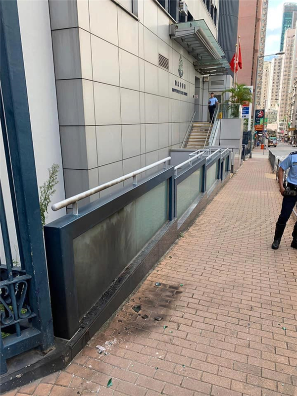 跑馬地警署外被人投擲汽油彈留下火燒痕跡。
