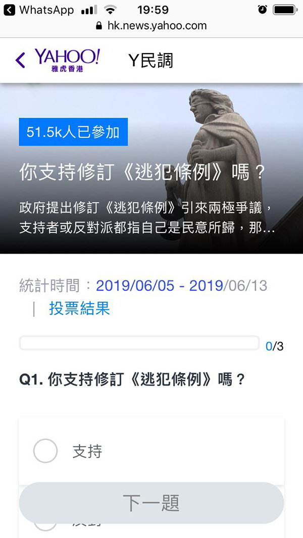 然而,記者親自參與投票,並選擇「支持」,但到最後顯示結果的界面時,投票所選擇的「支持」竟變成了「反對」。記者再以另一電腦進行投票,並投以「反對」,而結果則顯示「反對」。換言之,無論選擇「支持」或「反對」,最終結果仍然是「反對」。據網站顯示,該項調查的結果是反對63.8%、支持33.7%、中立/無意見2.5%,超過5萬人次參與,統計時間是6月5日至13日。