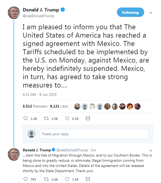 美东时间6月7日晚,美国总统特朗普宣布,目前已经与墨西哥达成贸易协议,原本定于下周一对其加征关税的措施将被」无限期暂停「(indefinitely suspended)。