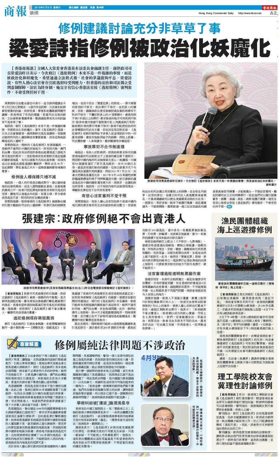 【香港商報網訊】全國人大常委會香港基本法委員會前副主任、前律政司司長梁愛詩昨日表示,今次修訂《逃犯條例》本來不是一件複雜的事情,而是被政治化和妖魔化,希望通過立法程式後,社會的爭議能夠平息。梁愛詩說,有些人擔心法官會在引渡逃犯時受到壓力,但香港的法治和司法獨立受到憲制保障,法官為終身制,她完全有信心香港法官按《逃犯條例》審判案件,不會受到任何干預。