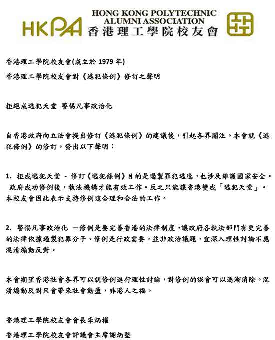 【香港商報網訊】昨日,香港理工學院校友會就《逃犯條例》修訂發布聲明,期望香港社會各界可以就修例進行理性討論,對修例的誤會可以逐漸消除。聲明指出,混淆煽動反對只會帶來社會動蕩,非港人之福。