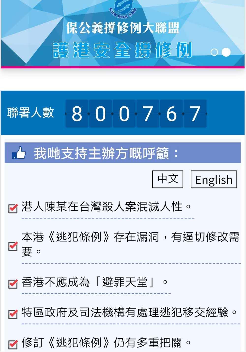 「保公義撐修例大聯盟」自上月開始在全港擺設街站,向香港市民派發《逃犯條例》修訂單張,介紹修訂具體內容,並呼籲市民加入網絡聯署支持修例。大聯盟昨於政府總部外舉行發布會,宣布截至昨午最新的聯署數目達73萬,並遞交請願信予保安局副局長區志光。時至昨晚9時,聯署數目更累積增加至近78萬。值得注意的是,就在反對派示威遊行、借題炒作之際,從前天夜裏至昨日一天,聯署數大漲20來萬人,彰顯了強大的主流民意。