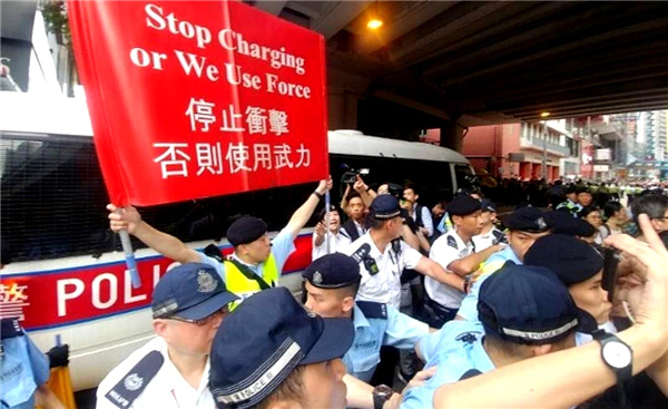 警方於灣仔鵝頸橋遇到示威人士衝擊,一度舉起紅旗警告。