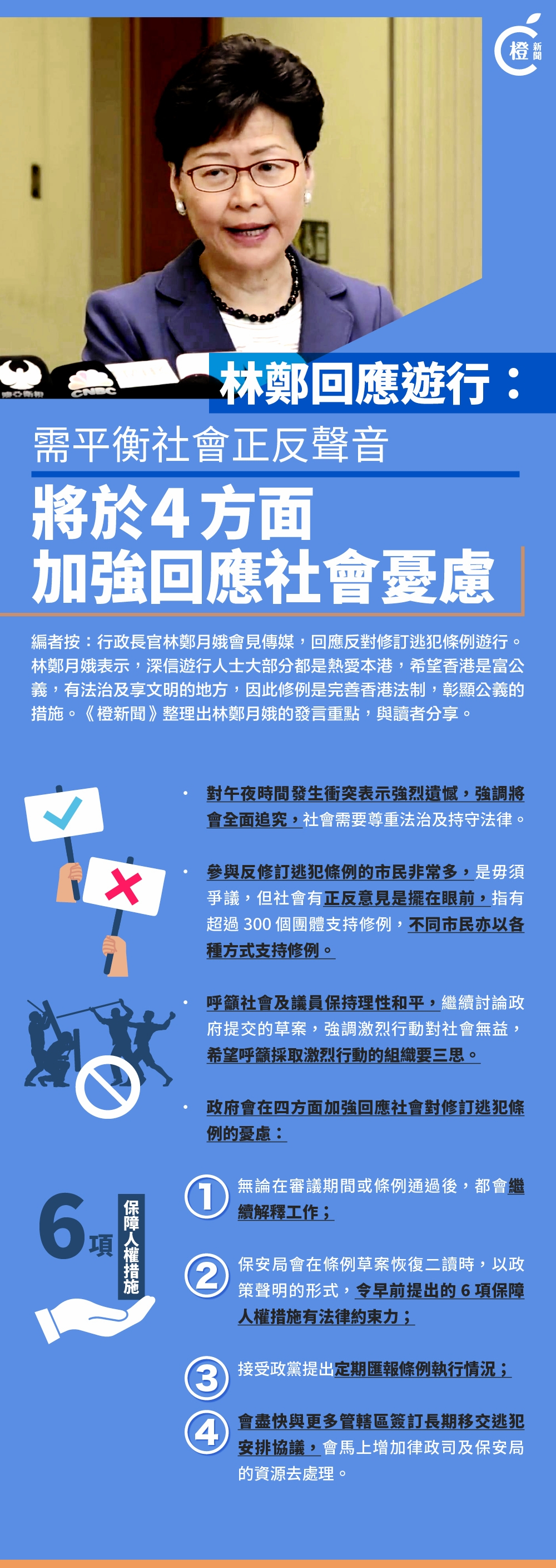 因應昨日的遊行,林鄭月娥今日上午11時過後,在行政長官辦公室地下大堂會見傳媒。林鄭指出,昨日的遊行人數非常多毋庸爭議,但大致和平有序,這充分證明香港是個文明社會,在基本法保障下,港人是有言論及集會自由,傳媒亦有新聞自由。
