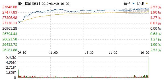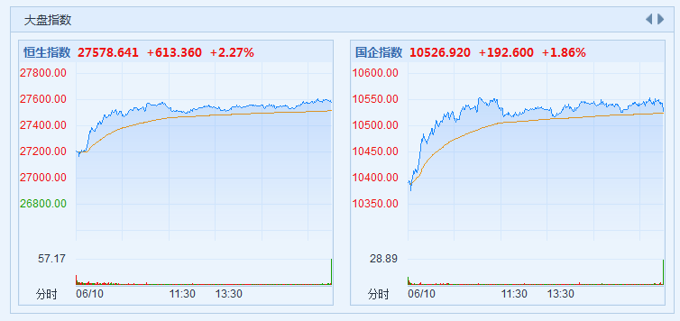 【香港商报网讯】6月10日,港股全线爆发,三大股指涨幅均在2%左右。港股恒指高开高走,截至收盘,恒指涨幅扩大至2.27%,报27578.64点,累计涨幅高达613点;国企指数涨1.86%,报10526.92点;红筹指数涨1.87%,报4353.97点。大市成交908.65亿港元。