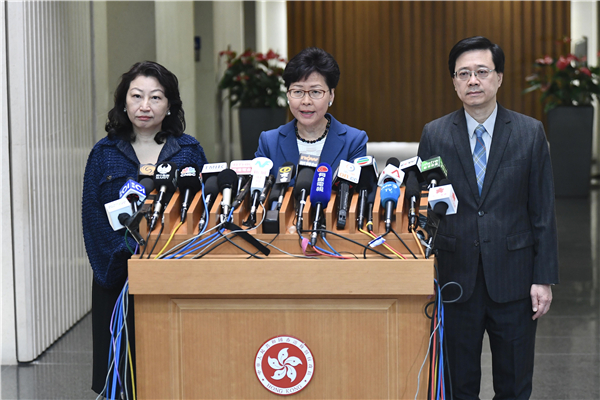 行政長官林鄭月娥昨在律政司司長鄭若驊(左)和保安局局長李家超(右)的陪同下會見傳媒,並首度回應有關反對派就修訂《逃犯條例》發起的遊行。中通社