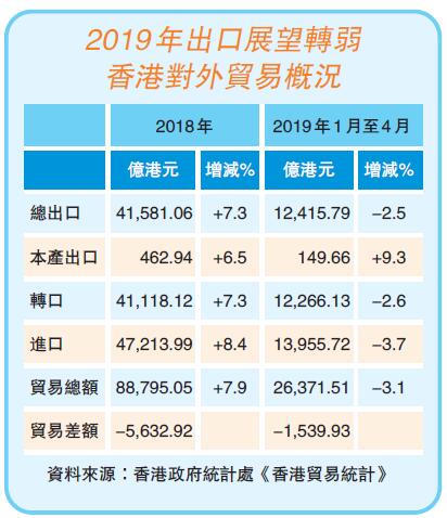 政府統計處數字顯示,今年首4個月,香港出口總額按年下跌2.5%,對美國出口更按年跌11%,對日本的出口也按年跌5.5%。相反,對歐洲出口按年增長8.2%,略為抵銷對美國和日本出口的下跌。