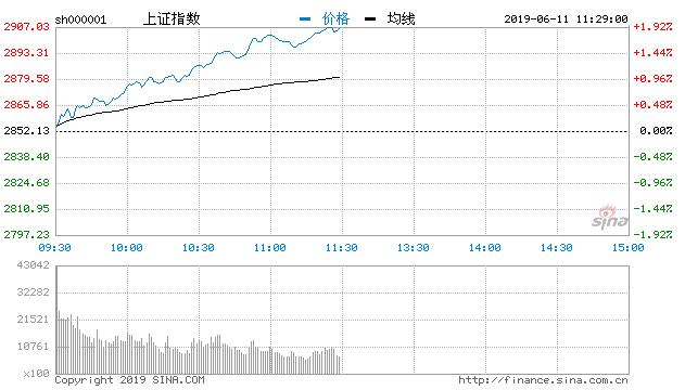 新浪財經訊 6月11日消息,兩市指數早盤小幅高開,隨后股指震蕩上行。人造肉、基建板塊高開后高走,稀土、農業概念股盤中崛起。隨著,多板塊拉升的積極影響,交易量顯著放大,滬指、創指持續走強。總體上,板塊個股普漲,北向資金凈流入超20億元,市場總體氛圍再度趨于活躍。臨近上午收盤,三大股指持續震蕩攀升,券商股助力股指漲幅在擴大。隨后市場題材概念多點開花,券商、核電、稀土以及半導體等板塊持續拉升,滬指盤中重返2900點點位,漲幅達1.7%,兩市個股呈現普漲格局,僅一百余股下跌。截止上午收盤,滬指報2905.45點,漲1.87%,深成指報8964.88點,漲2.91%;創指報1476.21點,漲3.13%。