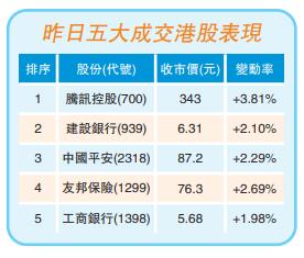 大市上升股份比例為66%,下跌股份比例為34%。藍籌股差不多全線上升,騰訊((700)曾飆4%,高見343.8元;收報343元,升3.8%,貢獻恒指101點。金融股合力推高大市,友邦保險(1299)連升3日,收市漲2.7%;港交所(388)升2.9%;滙豐控股(005)升1.5%;工行(1398)、中行(3988)、建行(939)三大內銀股升1.2%至2.1%。