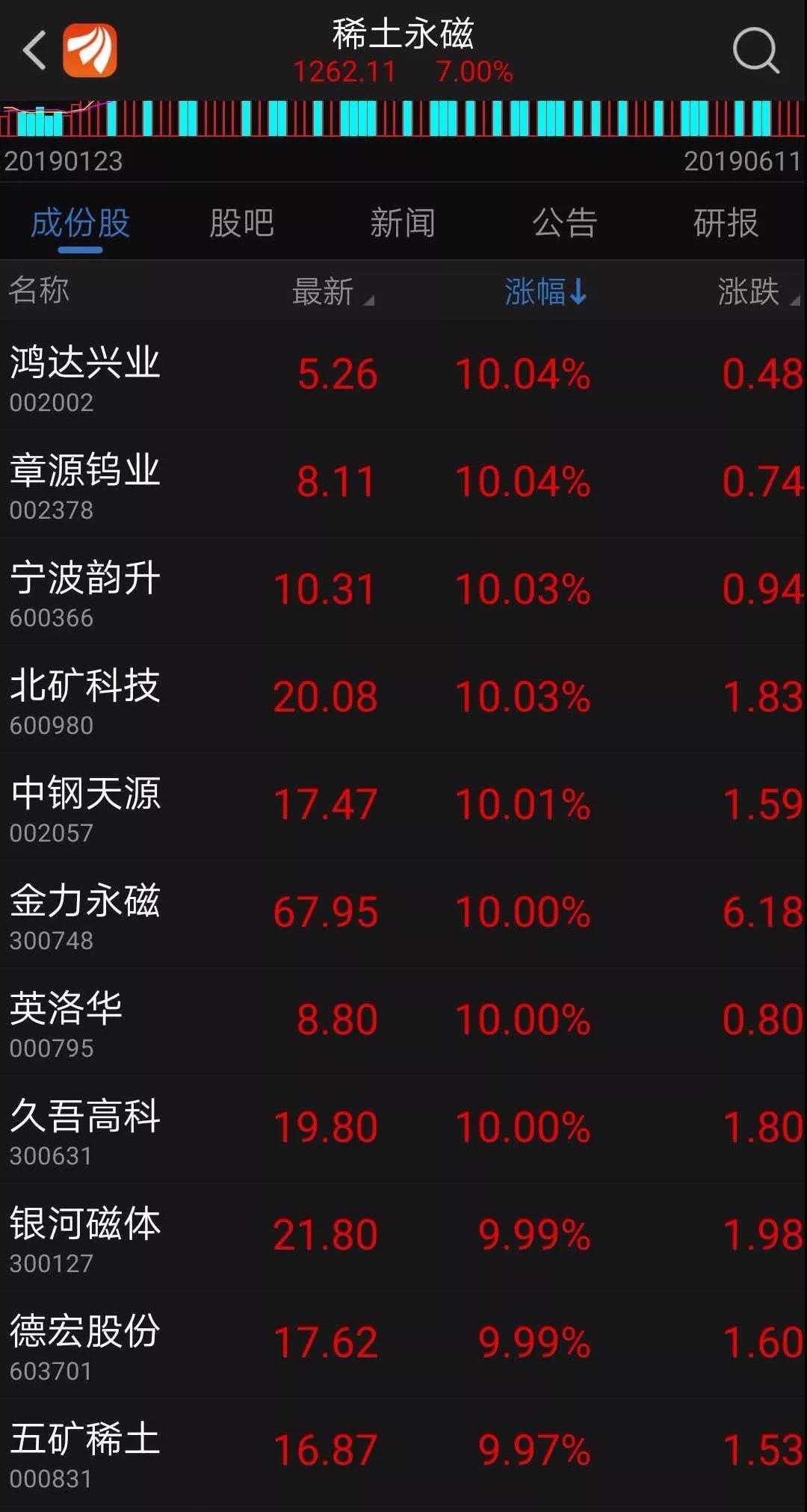 6月11日,稀土永磁板块大涨7%,板块指数创近期新高。五矿稀土、金力永磁、宁波韵升等13只稀土永磁股涨停。