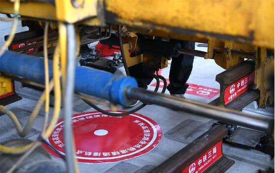 6月12日,在京张高铁清华园隧道,铺轨车在进行铺轨作业。新华社记者 张晨霖 摄