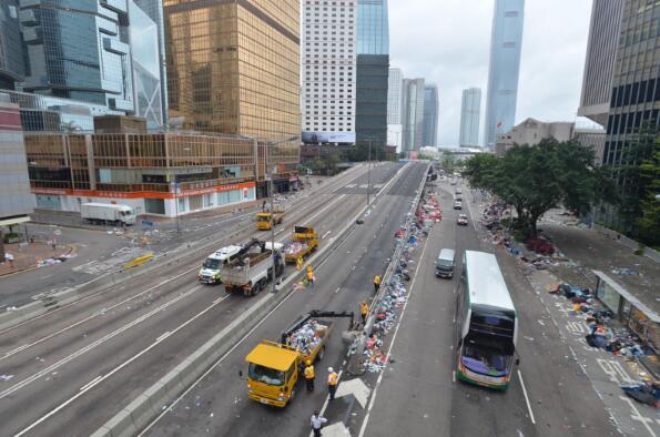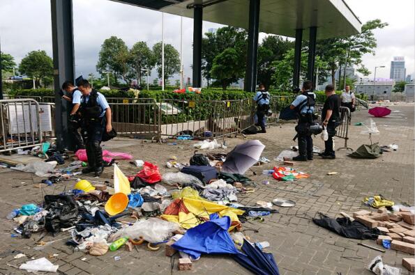 警方昨晚持續驅散示威者,到凌晨1時過後,示威者陸續散去。警方在清晨5時開始,清理干諾道中由鐵馬、竹枝、雜物堆成的障礙物。至今早約六時半,金鐘及灣仔一帶路面大致清理完畢,但灣仔添美道及添華道仍然封閉,龍和道部份路面仍有雜物,龍和道隧道西行慢線有3部車輛仍未清理,金鐘夏愨道西行仍然封閉。