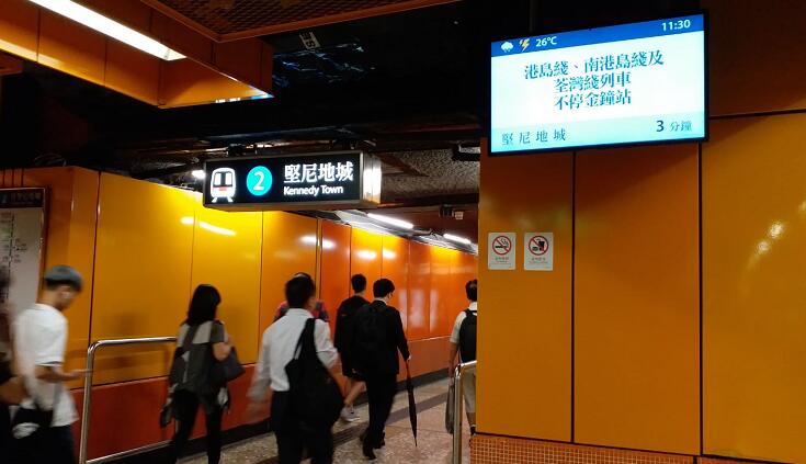 港鐵在北角站電子屏幕發通告,表示港島綫、南港島綫及荃灣綫列車不停金鐘站。(記者區天海攝)