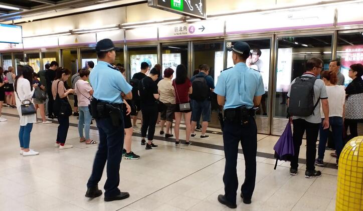 在港鐵油塘站有警員在月台站崗,預防有突發事件發生。(記者區天海攝)