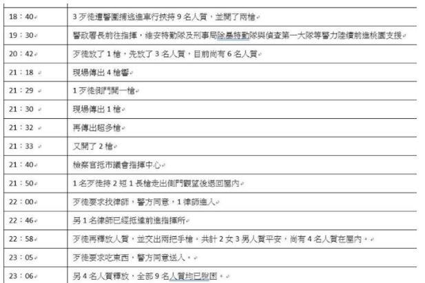 犯嫌与警方谈判后,先释放两名女人质并交出1把手枪。现场警方见歹徒态度软化,便联系嫌犯母亲、女友到场,但两人见到家属后情绪激动,最后朝屋外开枪,警方见状连忙撤离家属,交由谈判专家与歹徒谈判。在获悉歹徒的帮派背景后,警方还找来同帮派的一名资深“大哥”,出面和嫌犯周旋。