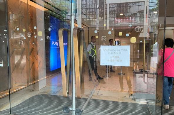 示威者昨日暴力衝擊立法會,金鐘附近一帶的道路亦被霸佔,交通嚴重擠塞。位於金鐘道的太古廣場今早貼出告示,商場暫汀業,商場内的商舖均未有營業,僅有昏暗的照明。