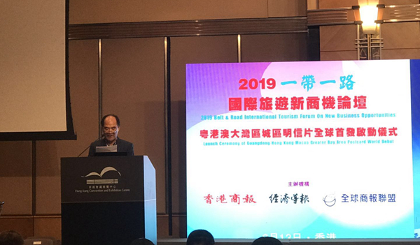 【香港商报网讯】6 月13日,由香港商報、經濟導報及全球商報聯盟舉辦的「2019 一帶一路國際旅遊新商機論壇」暨「粵港澳大灣區城區明信片全球首發啓動儀式」, 在假香港灣仔會議展覽中心舉行。論壇邀得國家文化和旅遊部港澳台辦公室巡視員滿宏衛、中聯辦宣傳文體部副部長羅江、外交部駐香港特派公署新聞及公共關係部主任李華、亞洲旅遊交流中心主任崔素香、香港旅遊業議會主席黃進達、香港旅遊發展局副總幹事葉貞德等擔任主禮嘉賓。