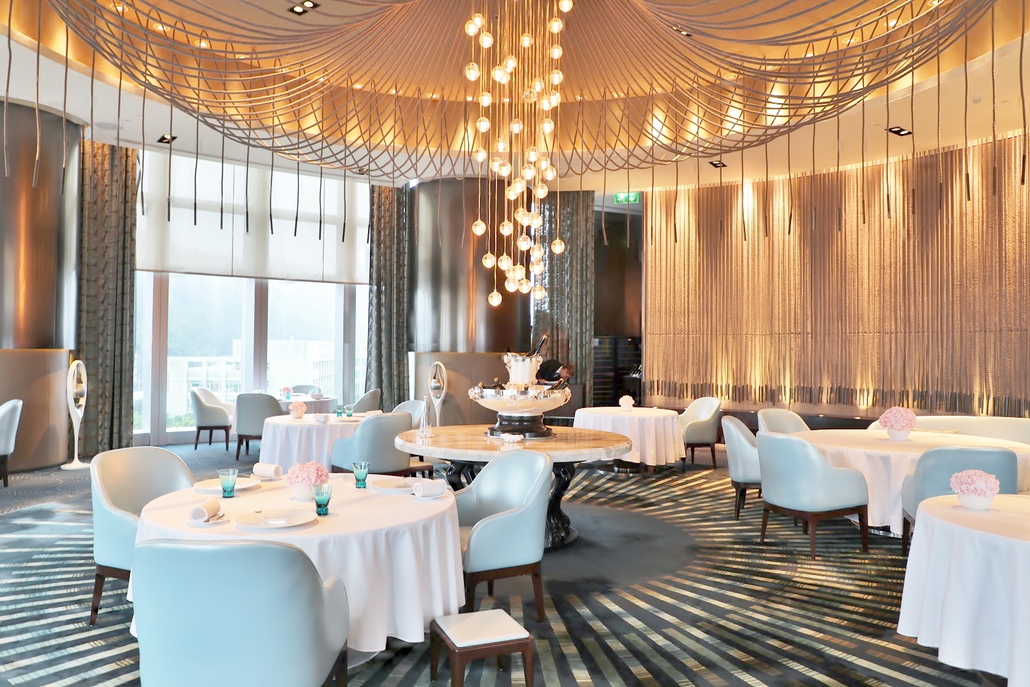 摘星高手X米芝蓮常客,筆者作為一名不折不扣的吃貨,未出發先感到興奮。有別以往優雅嚴肅的法國餐廳印象,The Tasting Room反倒給人一種放鬆寫意感覺,一進門先有時尚的酒吧區,餐廳內一整列落地玻璃窗可讓食客靜賞路氹美景,中央垂簾的吊燈華麗摩登,配搭粉藍色的用餐桌椅,設計疏落有致,讓食客有足夠的空間賞用美食。