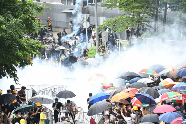 金鐘一帶昨日發生騷亂,示威者佔據主要道路,警方不得不放催淚彈驅散人群。記者馮瀚文攝